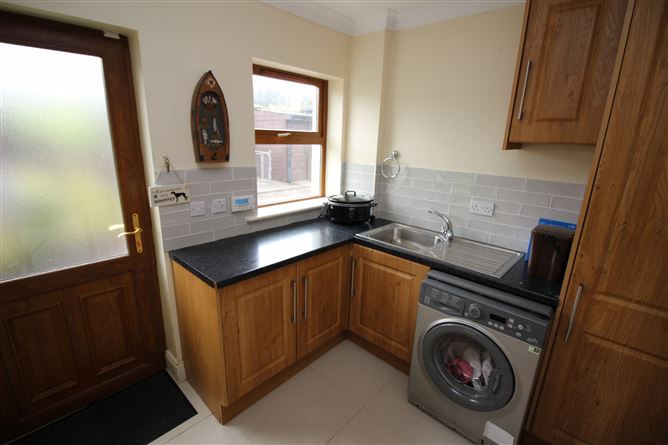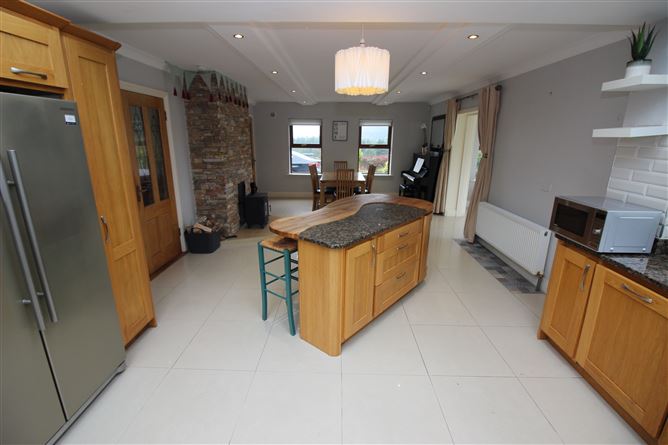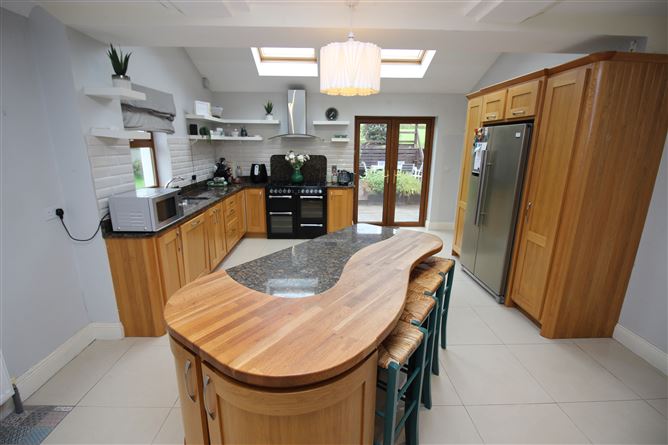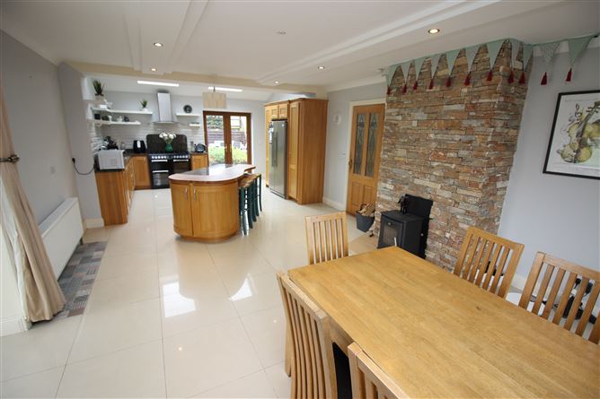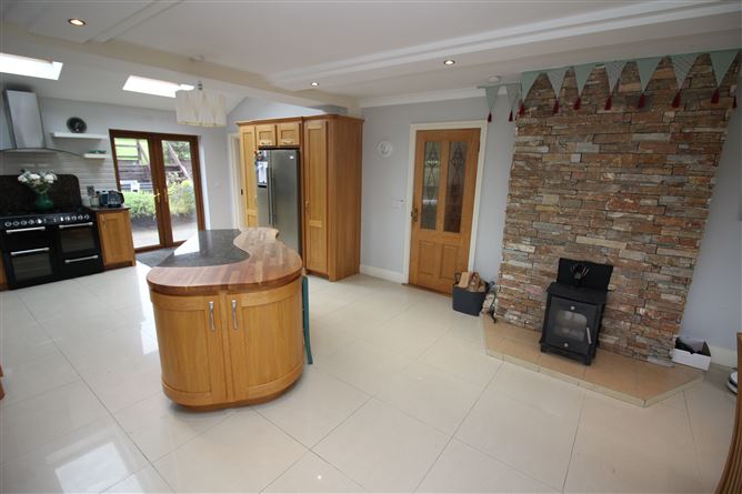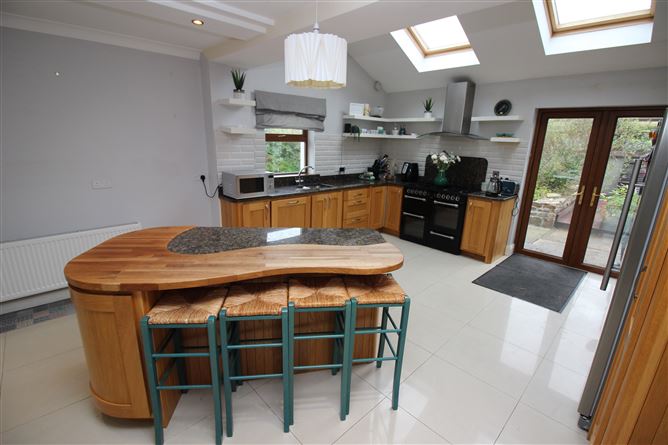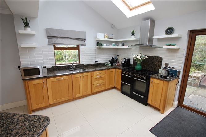 Tiled flooring, solid fuel stove, fitted kitchen, breakfast bar, sink, granite worktop, tiled splash back, cookmaster microwave & hob, belling extractor fan, integrated zanussi dishwasher, samsung fridge/freezer, velux windows, french doors to rear garden.